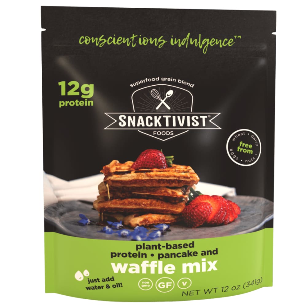 Get your daily protein in one delicious meal! Snacktivist Foods Plant Protein Waffle & Pancake mix has 12 g of protein per serving – and it's still gluten-free, vegan, and non-GMO! Just add water and a spoonful of oil and they are ready for the griddle.