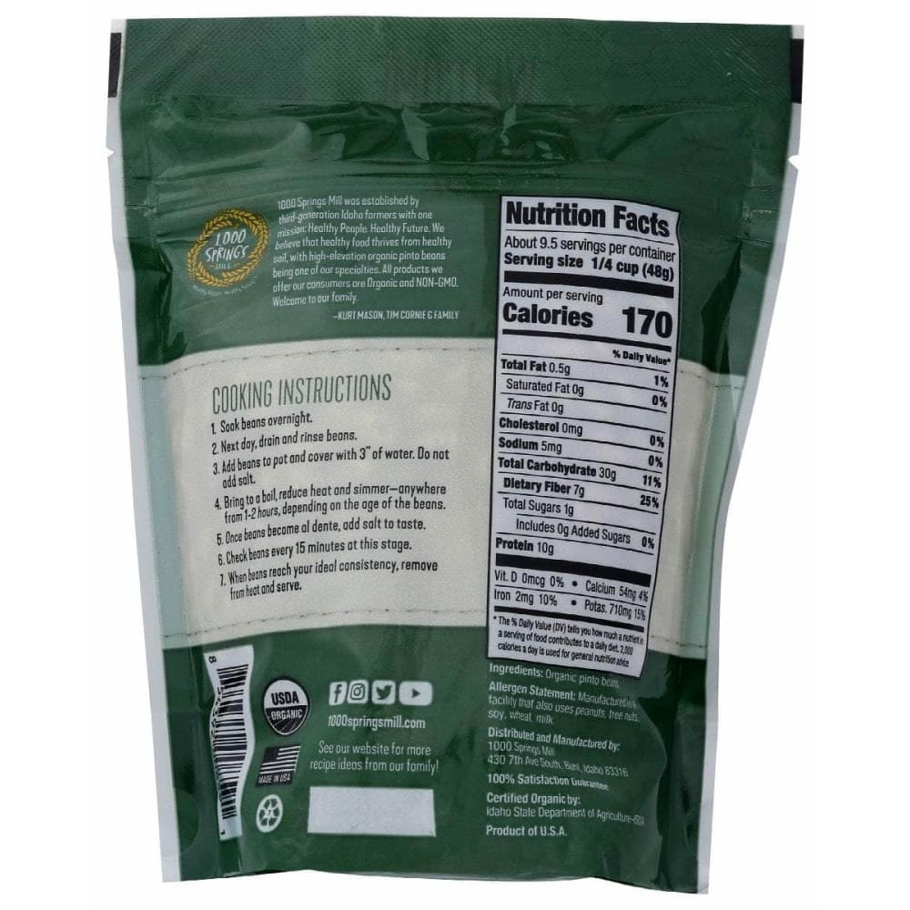 We believe that you and your family deserve the best quality food, free of harsh chemicals and unnecessary additives, the way food was intended. We worked for 3 years so our soil could be cleaned of all pesticides and chemicals, leaving us with the healthiest product possible. We did this because we know how eating unhealthy foods can make you feel depleted and fatigued. You donโt have to settle anymore for unhealthy foods. With our products, you can grow together as a family. Thousand Springs Mill, Healthy People, Healthy Future.ย Pinto beans are an excellent source of low-fat, plant-based protein. They also offer significant fiber that helps regulate blood sugar and makes you feel full longer, promoting weight loss. Consumption of pinto beans may lower LDL cholesterol levels and reduce risk of heart disease, diabetes and other metabolic disorders.
