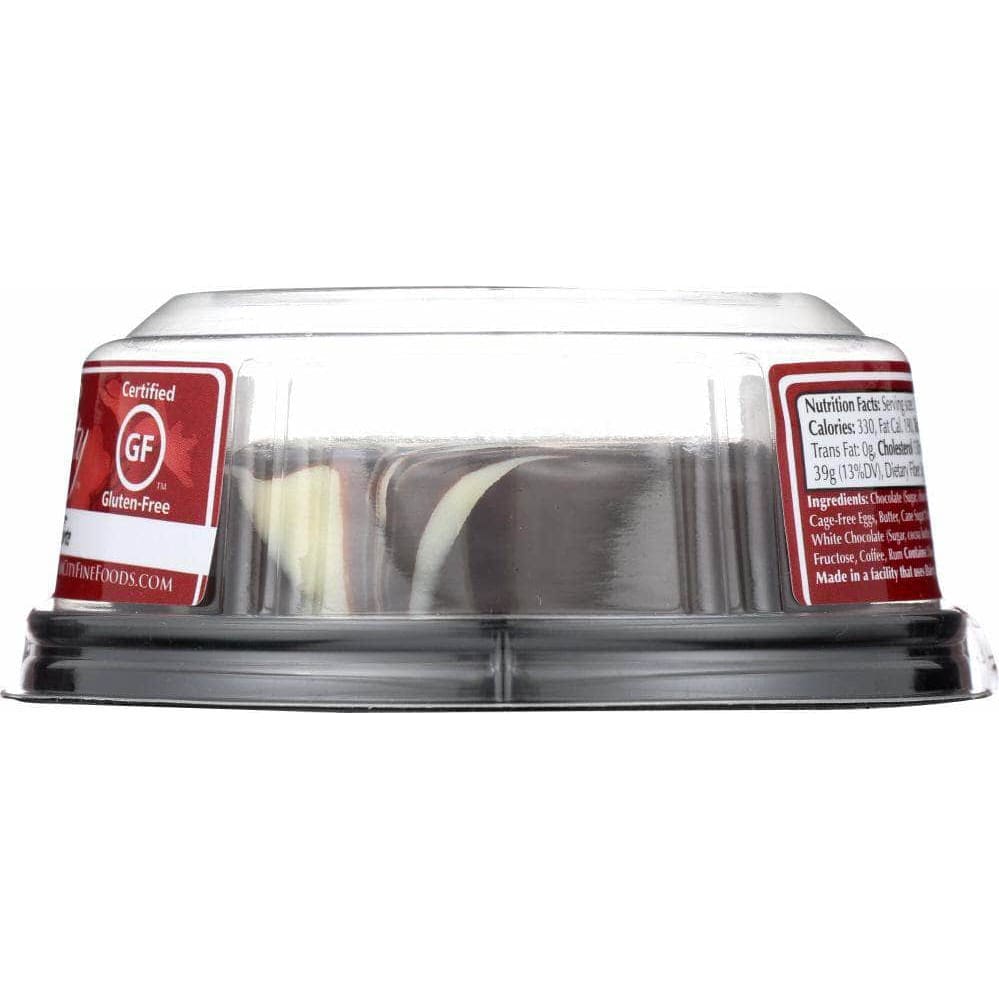 Decadently rich bittersweet chocolate with a hint of coffee adds depth to this rich flourless cake. Finished with chocolate ganache and swirled with white chocolate. A rich, melt-in-your-mouth sensation. Certified gluten free, nut free, dedicated bakery.