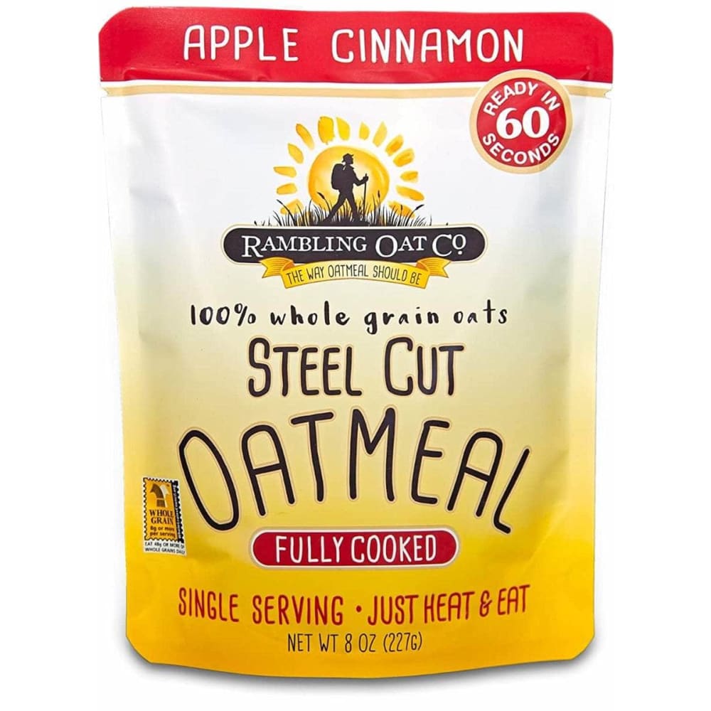 The Rambling Oat Co. was founded on the idea that the simplest things in life are the best. On that premise, we have created fully cooked steel-cut oatmeal in the convenience of a single serving pouch. No mixing or measuring, just heat it, and eat it!Steel-cut oats are 100% whole grain oats that are cut, not rolled, and make a full-bodied hearty hot meal (not soft and mushy). But this less-processed grain takes a longer time to cook, so it’s often overlooked in favor of the many “instant” oatmeals on the market. Now you can enjoy fully cooked steel-cut oats any time you like.In just one minute you’ll be enjoying a hearty serving of deliciousness! And while we love to eat our oatmeal in the flavors we’ve chosen, steel cut oats pair well with fruit, nuts, or even a dollop of Greek yogurt