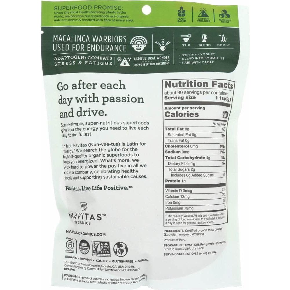 Navitas Organics Raw Maca Powder balances the body's delicate endocrine system, supporting natural energy and vitality—without the undesirable effects of stimulants. It's a fiber-rich food and a good source of plant protein—about 10%. Maca root is also packed with essential fatty acids. Navitas Organics Maca Powder is full of non-traditional nutrients that aren’t accounted for on the standard nutrition label, yet are vital to fighting day-to-day stress, and enabling health and well-being.