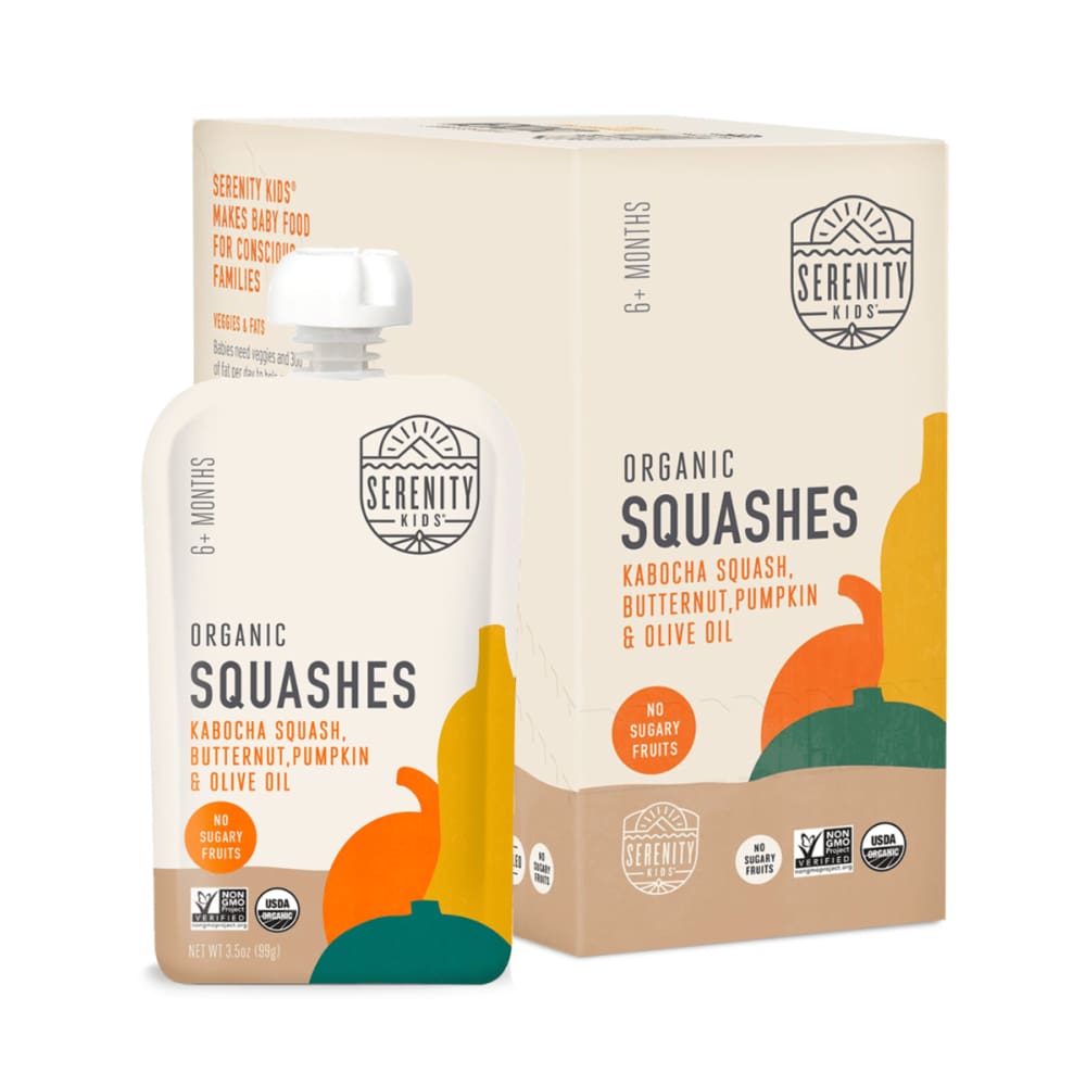 Our Organic Squashes baby food is packed with nutrition and flavor because every bite counts! This savory blend of our favorite squashes has zero added sugars or sugary fruits which allows your little one to develop a love for the rich taste of squashes at an early age. We add organic olive oil for essential fatty acids that aid in nutrient absorption and brain development. Plus, we only use the highest quality of ingredients that are USDA certified organic and grown exclusively on American farms!ย