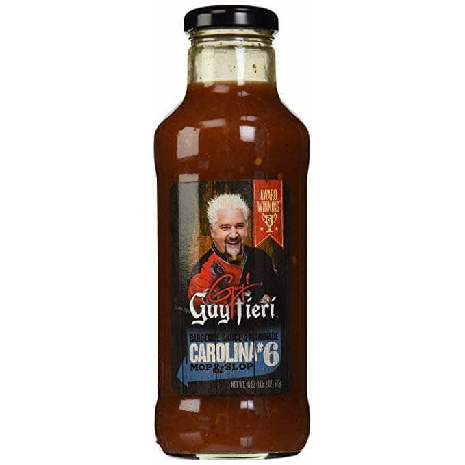 Guy Fieri Carolina #6 mop and slop barbecue and marinade is the perfectly tangy and versatile "mop and slop" sauce. Apple cider vinegar, sweet brown sugar and a little bit of cayenne pepper heat is a rocking' combination to be slopped right on pulled pork.