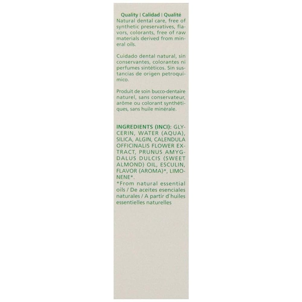 Gentle effective cleanser with pleasant-tasting, essential oils. Silica gently cleans teeth to help keep teeth clean and refreshed. Fluoride-free. Free of sugar, artificial sweeteners, surfactants, synthetic preservatives, flavors, colorants, or raw materials derived from mineral oils. No harmful ingredients if swallowed. Certified natural by NATRUE.