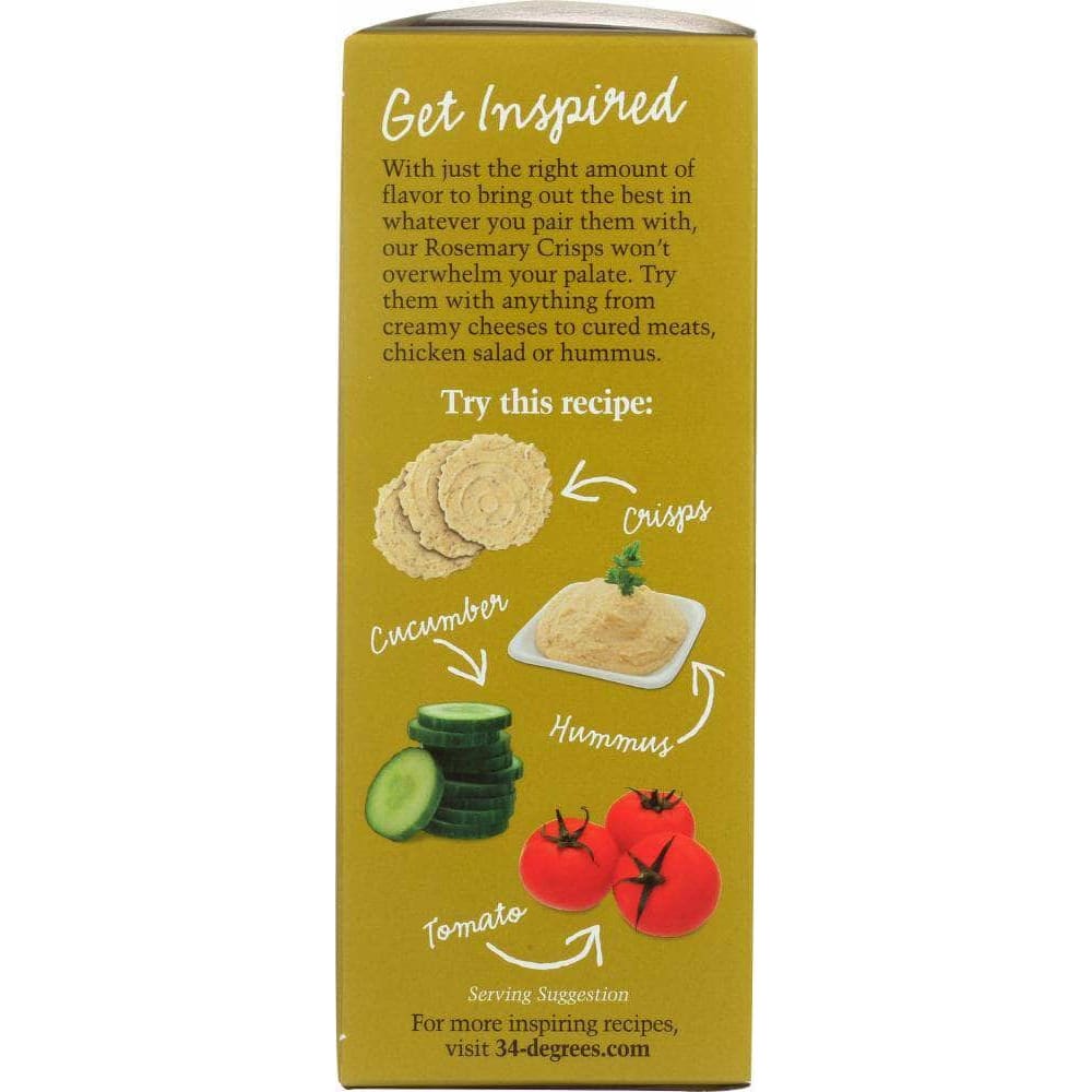 With just the right amount of flavor to bring out the best in whatever you pair them with, our 34 Degrees Rosemary Crisps won't overwhelm your palate. Try with anything from creamy cheeses to cured meats, chicken salad or hummus.