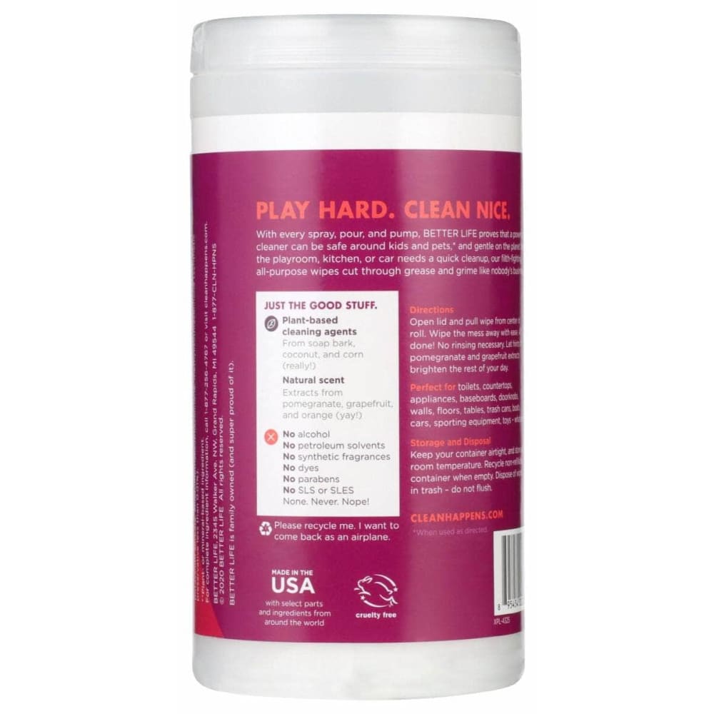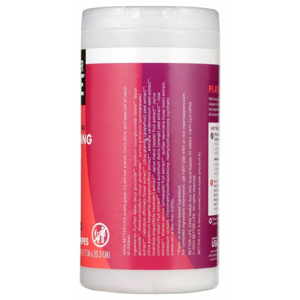 BETTER LIFE Naturally Filth-Fighting All-Purpose Wipes cut through grease and grime like nobody's business. When the playroom, kitchen, or car needs a quick cleanup, wipe the mess away with ease. With biodegradable ingredients that are gentle on the planet, you can feel good about bringing this product home.
