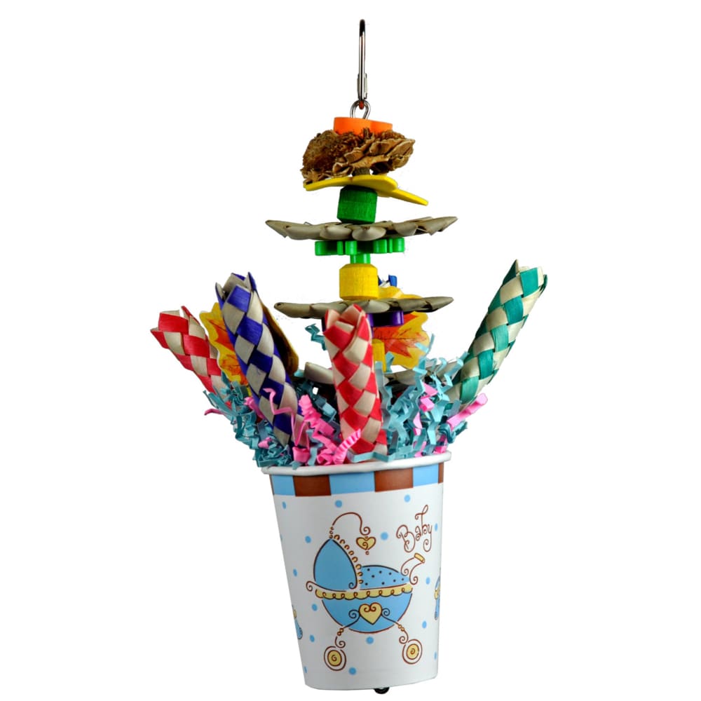 Happy Beaks by A&E Tropic Punch Cocktail bird toy is party in a cup for your bird. It is made with a real paper Hawaiian themed cup. It is a fun toy that encourages your birds natural instinct to forage and play with its colorful and fun design. Toys offer birds to play which help foster better mental health and independence. It includes all sorts of treats such as finger traps, palm stars, plastic stars and lots of shreddable natural toy parts to keep your bird busy for hours. This product is made in the USA. It measures 12" x 8" x 8"
