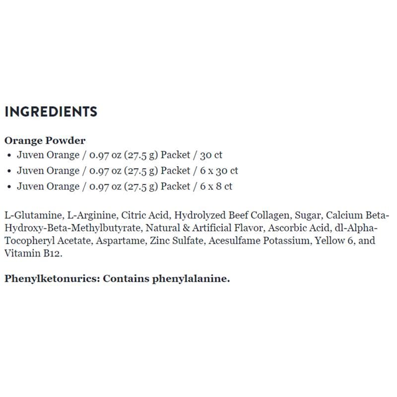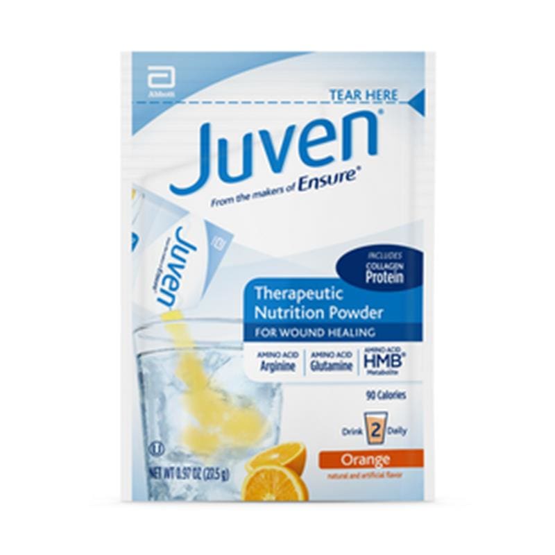 Juven Therapeutic Nutrition Drink Mix has a unique blend of key ingredients to support wound healing. The formula has been clinically shown to support wound healing in as little as 2 weeks, and to help build and maintain lean body mass (LBM) in 4 weeks. Recommend two packets per day. Administer orally or as a modular via feeding tube; use as part of a complete, balanced diet. Use under medical supervision. Flavor: Orange. Size: 0.97 oz. (27.5 g)/Packet, 30/case.