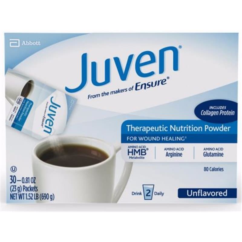 Juven Therapeutic Nutrition Drink Mix has a unique blend of key ingredients to support wound healing. The formula has been clinically shown to support wound healing in as little as 2 weeks, and to help build and maintain lean body mass (LBM) in 4 weeks. Recommend two packets per day. Administer orally or as a modular via feeding tube; use as part of a complete, balanced diet. Use under medical supervision. Flavor: Unflavored. Size: 0.97 oz. (27.5 g)/Packet, 30/case.