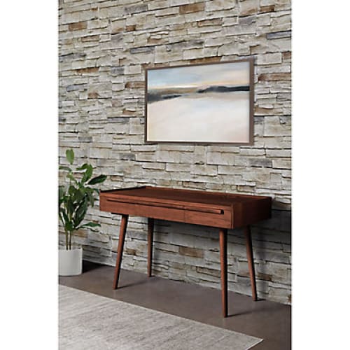 Place the minimal style Ana Writing Desk in a modern office. A neutral wood finish offers a chic color palette for sophisticated workspaces. Two narrow drawers allow you to store away office supplies and keep essentials close at hand. With a solid birch wood frame and spacious rectangular tabletop, this modern writing desk offers up plenty of space for large and small tasks. Place this writing desk in a modern office for a retro-inspired flair.