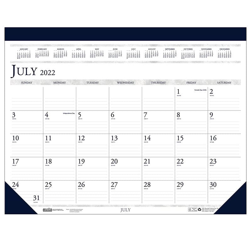 14 Months: July - August. Perforated at top. Printed in deep blue and gray. Holder with blue reinforced leatherette corners. Includes Julian dates and days remaining. Full year reference calendar on each month. Lightly ruled daily blocks. Printed on 100% post-consumer recycled paper with soy ink. Block size 3" x 2 1/8". Measures: 22 x 17". Made in the USA. FSC Certified.