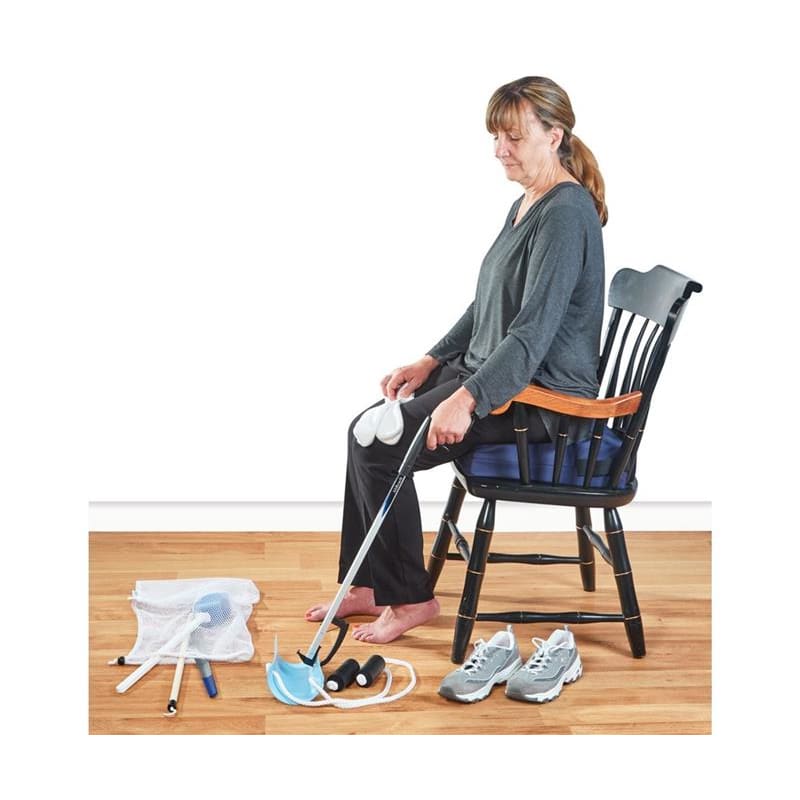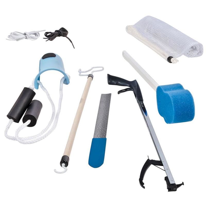 AliMed ADL Deluxe Hip Kits. These kits help the user dress independently while maintaining appropriate precautions. Each kit comes with a mesh bag to hold equipment and can be hung up in one convenient place. Size 1: For users 5'7" and under. Includes 18" Shoehorn, 26" AliReach Standard Reacher, Standard Sock-Aid, Dressing Stick, 2 pair of black elastic shoelaces, two pair of white elastic shoelaces, hourglass-shaped, long-handled sponge and a washable, reusable mesh bag.