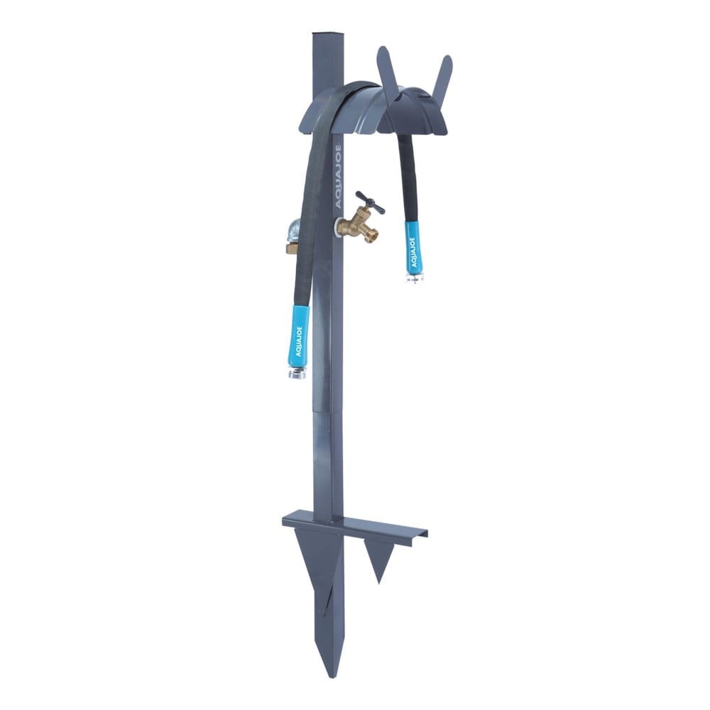 Say goodbye to tangled, heavy hoses and store your hose the neater way with the Steel Garden Hose Holder + Faucet from AQUA JOE. The 42.5-inch high, powder-coated pole and the curved hanger are weather-resistant for a long-lasting luster and make an elegant addition to any garden landscape. Heavy-gauge steel construction and a secure 2-point soil anchor system allow you to store up to 125 feet of your standard garden hose the stylish way while giving you easy access to your faucet. Don’t stay trapped against your house–simply connect your water source on one side, your hose on the other, and relocate the stand to a more convenient location, away from shrubs, delicate plantings, or cramped quarters. Or, if you want to tuck the stand against your home, Aqua Joe now comes with an included 3-ft tap extension hose! Perfectly suited for ideal hose stand placement and storage, this 3-ft fiber jacket tap attachment connects your outdoor spigot to the hose stand–for a solid, leak-proof connection. A solid brass spigot provides a secure, leak-proof connection for years of reliable performance in your yard and garden.