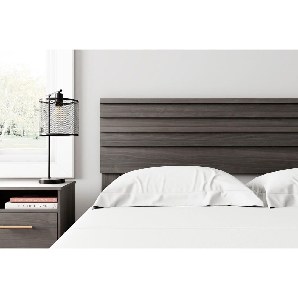 With clean lines evoking a mid-century modern mood, this panel headboard is designed to bring harmony to your bedroom retreat. Finished in a warm gray that enhances the soothing sensibility. Fits full-size beds.