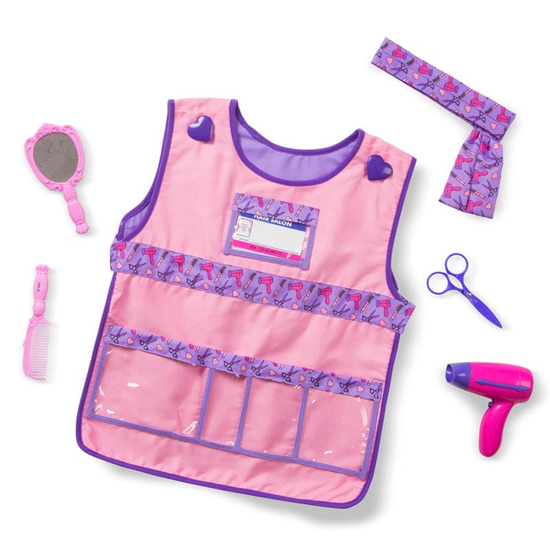 Make an appointment for fun with this realistic stylist set. Your young hairdresser can put on the machine-washable smock and the personalizable name card, then and use the comb and brush for a new style every day. The battery-powered hairdryer sounds like the real thing! Includes non-cutting scissors and a headband for accessorizing. Satisfied clients can check themselves out in the plastic hand mirror!