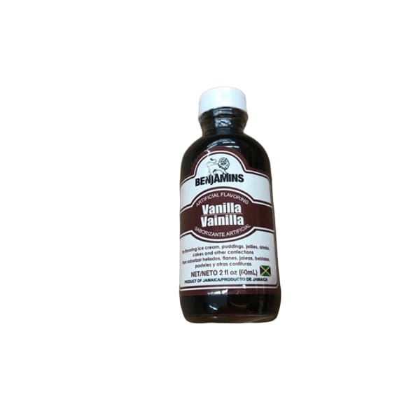 Benjamins Vanilla is an artificial food flavoring. This smell good Vanilla comes in a 16 fl oz glass bottle. Ingredients: Water, Alcohol 10% acl/vol, Vanillin, Approved Artificial Flavors, Caramel Coloring. Product is from Jamaica. For flavoring ice cream, puddings, jellies, drinks, cakes, and other confituras.