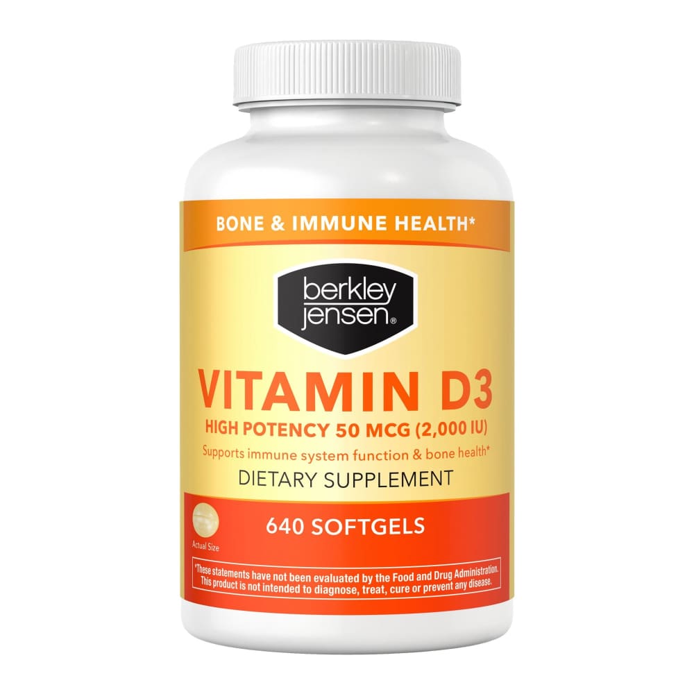 Berkley Jensen High-Potency Vitamin D3 Dietary Supplement supports bone health and aids in immune system function. This supplement contains no artificial flavors, preservatives, soy, lactose, dairy or gluten.