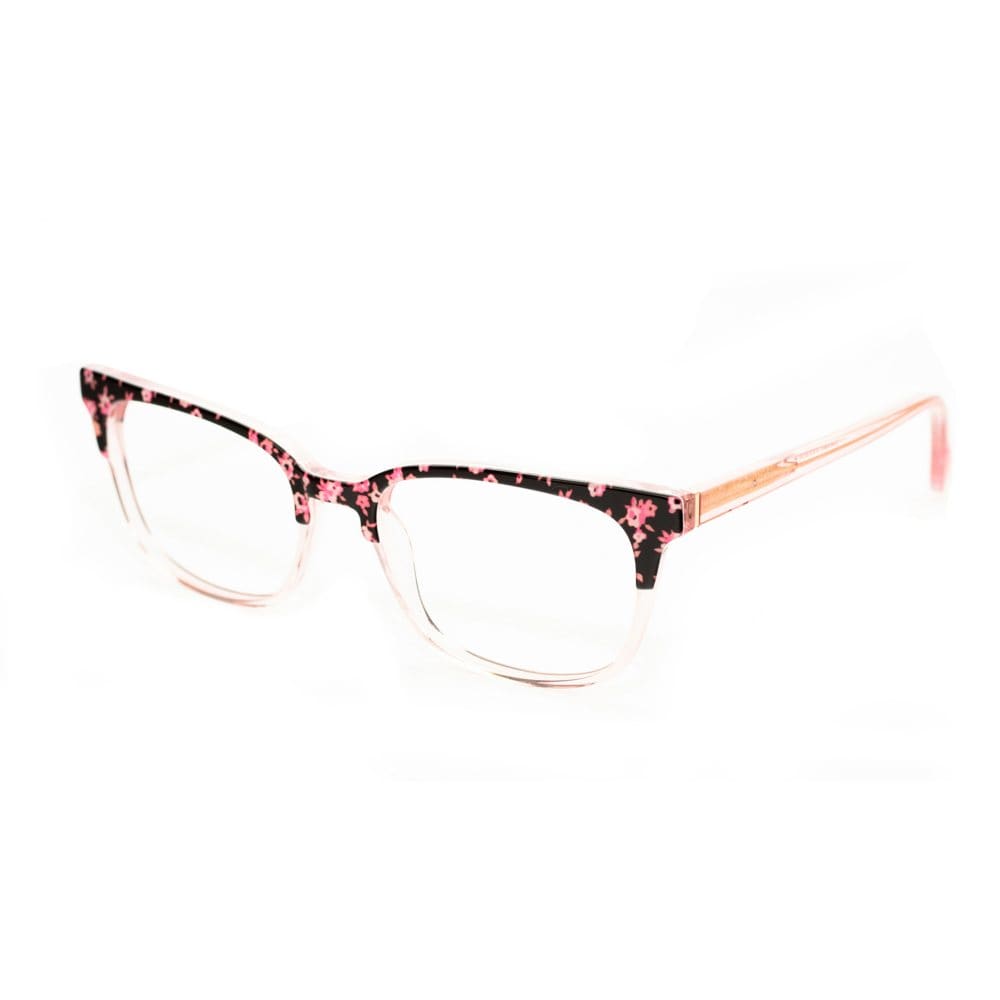 Creatively confident, this frame is both bold yet delicate in the details. The slightly upturned lenses and pink crystal allude to a signature Betsey Johnson style.