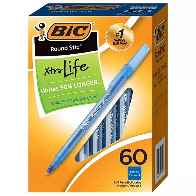 BIC Round Stic Xtra Life Ballpoint, 1mm, Medium, Blue, 60ct.