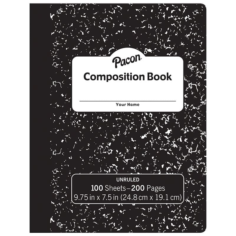 Black marble, hard cover composition book with 100 sheets to meet your needs. Sheets are unruled giving you all the space you need to draw and annotate. Great for drawing, note taking and journaling. Recyclable. Measures 9-3/4" x 7-1/2".