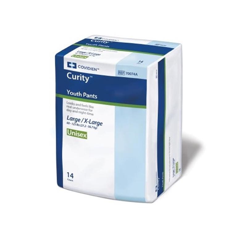 Curity Unisex Youth Pants. The Curity™ youth pant has a unisex design with colored threads to indicate the back. Its super-dry core and cloth-like backing make the pant perfect for overnight use. Plain white covering looks like real underwear. It features soft, stretchable sides and waist for comfort and fit, as well as tear-away side seams for easy removal. For improved protection, leg gathers and leak barriers are included. Size: Large/Extra Large, (60-125 lbs.) 14/Printed Bag, 4 Bags/Case.