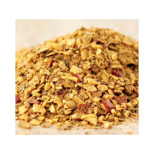 Ingredients: Garlic, Salt, Basil, Oregano, Red Pepper, Paprika, Rosemary, Ginger, Coriander, Thyme, Rosemary, Calicium Stearate, Turmeric, Citric Acid, Bay Leaves, Sage, Marjoram, Cumin, Black Pepper, Celery, Silicon Dioxide, Soybean Oil, Extractives Of Rosemary
