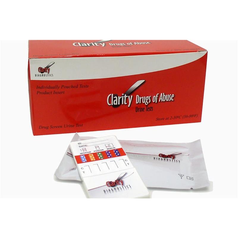 Clarity Drugs of Abuse 5-Panel Single Dip Urine Test. These easy-to-use single dip cassettes detect variance in pH, specific gravity, oxidants, PCC, creatinine, nitrates, and glutaraldehyde for error proof testing. The kits test for 5 drugs of abuse in urine with or without adulteration parameter. Features room temperature storage and 24 month dating. Each kit contains a Clarity Dip Card 5 Panel test for APM, COC, MAMP (MET), OPI2000(OPI), and THC. 25/box.