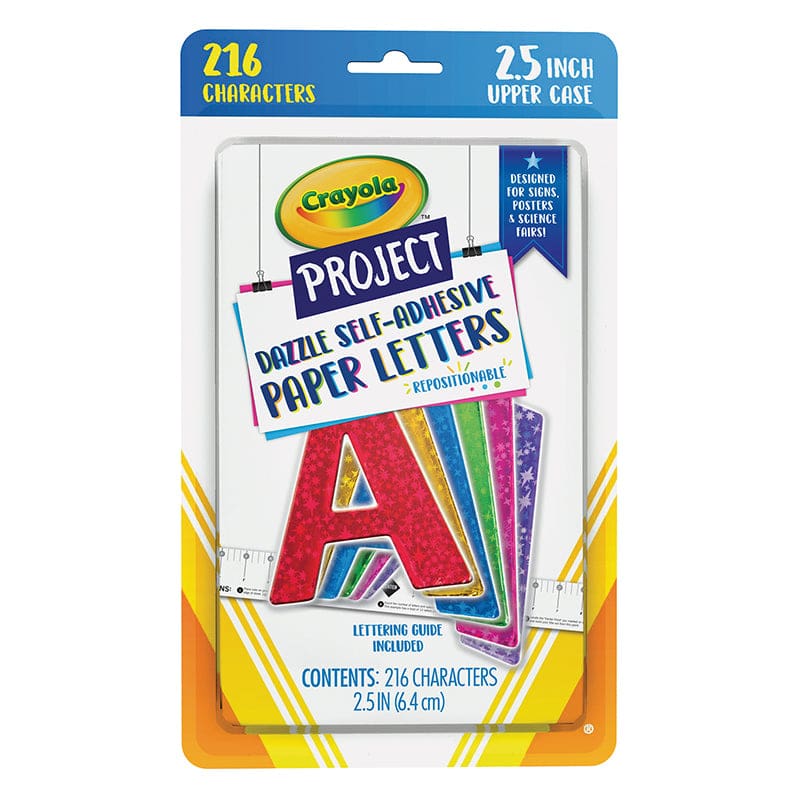 Each letter has a strip of repositionable adhesive that makes them easy to place. This helps when organizing and lining up the letters on a bulletin board, presentation board or on any type of project. To make the letters more permanent just glue, tack, staple or tape the letters in place. Letters measure 2.5". 216 Characters in assorted dazzle colors (red, gold, blue, green, pink, purple). Bonus lettering guide included.