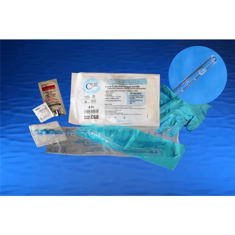 Cure Catheter Closed System Kits. The sterile, single-use, unisex Cure Catheter Closed System features polished eyelets on a pre-lubricated straight catheter tip with integrated 1500 ml collection bag. This complete urinary catheterization kit includes the Cure Catheter, a nonstaining BZK wipe, three (3) povidone-iodine swabsticks, one pair of ambidextrous gloves, a sterile wipe, and an underpad. Size: 8 Fr. 100/case.