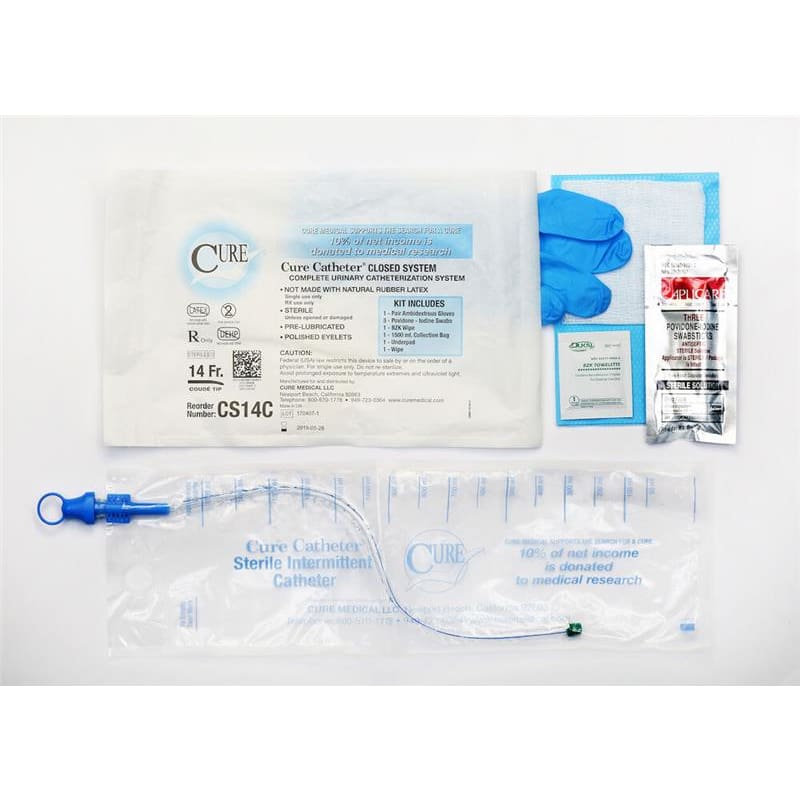 Cure Catheter Closed System Kits. The sterile, single-use, unisex Cure Catheter Closed System features polished eyelets on a pre-lubricated straight catheter tip with integrated 1500 ml collection bag. This complete urinary catheterization kit includes the Cure Catheter with coudé tip, a nonstaining BZK wipe, three (3) povidone-iodine swabsticks, one pair of ambidextrous gloves, a sterile wipe, and an underpad. Size: 14 Fr. 100/case.