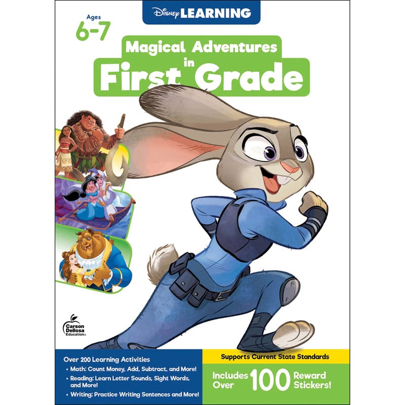 The Disney Learning Magical Adventures in First Grade workbook offers 200+ grade-specific math and language arts activities. Disney friends from Moana, Beauty and the Beast, Zootopia, and more invite young learners to join them on fun learning adventures. Kids can't wait to practice alongside familiar friends, including Moana and Maui, Belle and Beast, and Judy and Nick as they learn important school skills.