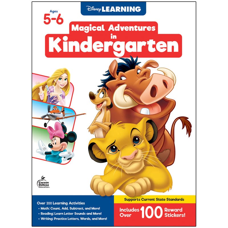 The Disney Learning Magical Adventures in Kindergarten workbook takes young learners on an adventure through 200+ grade-specific math and language arts activities! Fun activities encourage kids as they learn important school skills with their favorite Disney characters, including Mickey, Simba, and Rapunzel.