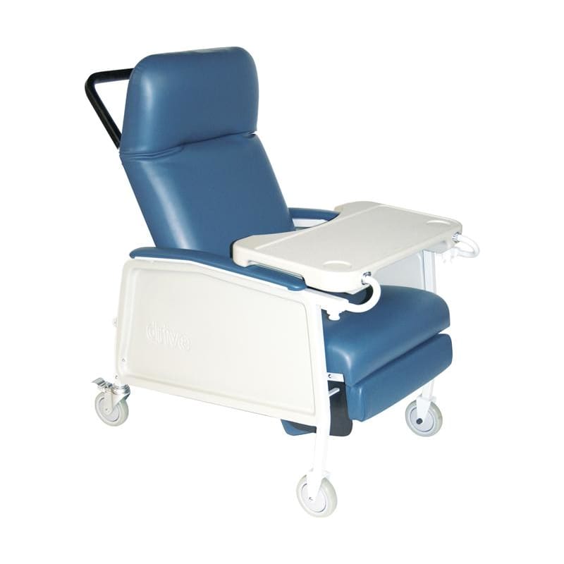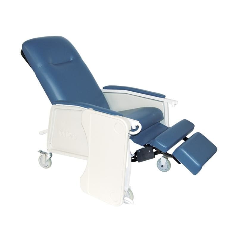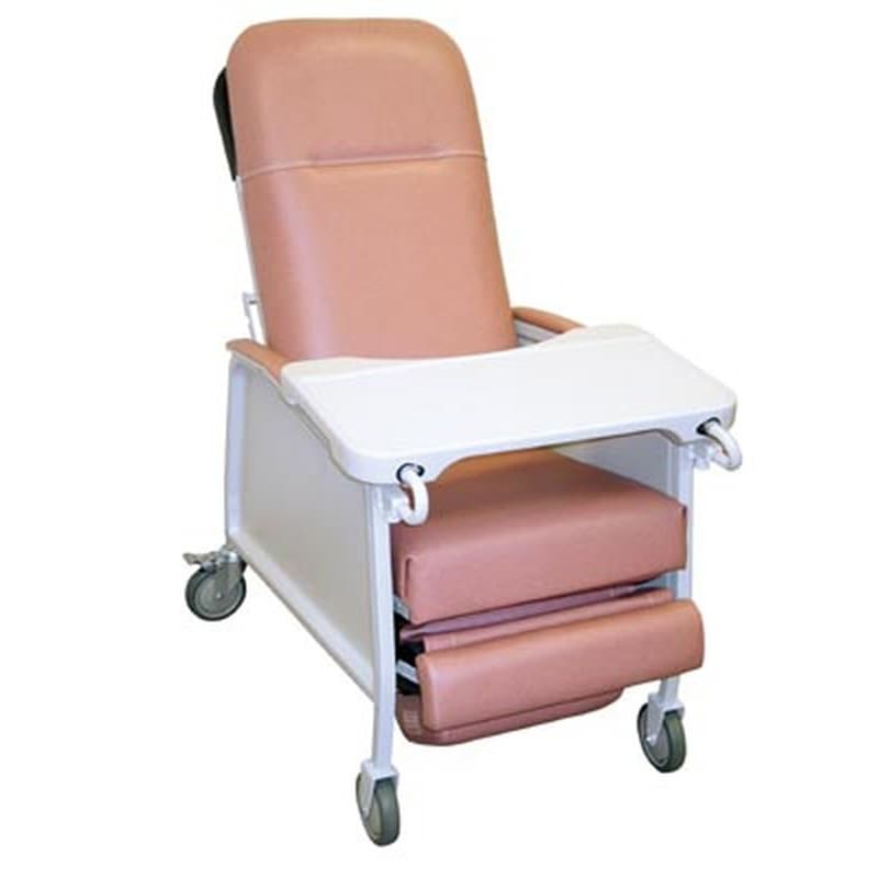 3-Position Recliner with upright, deep recline and elevated leg rest/footrest positions. The extractable lock bar secures the chair in the desired position while the side panels โpop offโ for easy cleaning and maintenance. Large, blow-molded tray locks in 5 positions and can be stored on the side of the chair. 5" casters (2 with locks) make it easy-to-move and secure the recliner and comfortable armrests are angled to provide support. Moisture barrier on seat prevents seepage. Color: Rosewood.