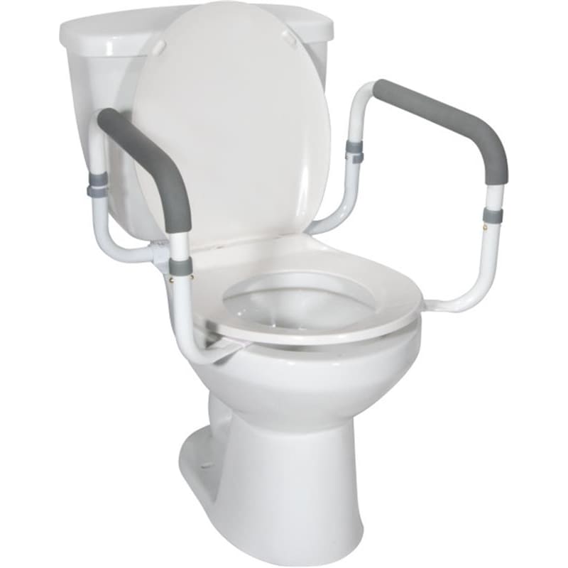 Toilet Safety Rail. This rail allows individuals to safely sit or stand. Features soft, padded handles for comfort and easy, tool-free assembly and installation. The width adjusts from 16.5" - 19.5" between handles. 2/case.