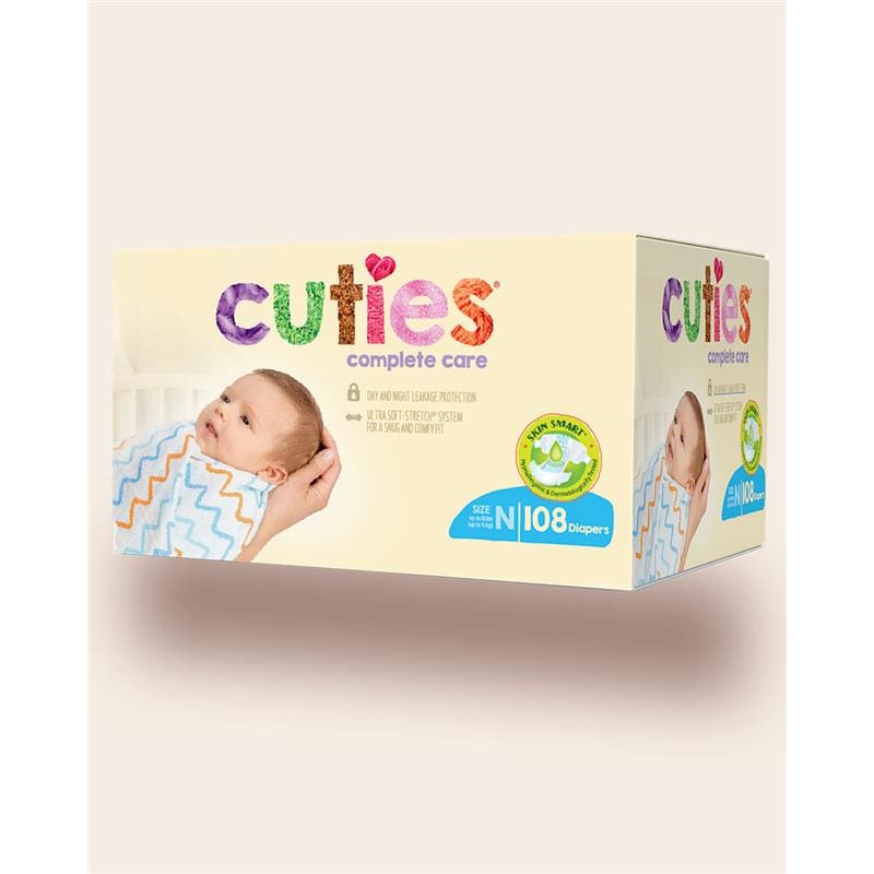 Cuties Disposable Newborn Diapers. These diapers feature an ultra-absorbent core to combat leakage. They are made with hypoallergenic materials to minimize allergic reaction and the soft breathable outer diaper fabric reduces the risk of skin irritation on baby's sensitive skin. With ventilated areas that allow air to freely pass to baby's skin which helps reduce heat build-up and a customized fit with adjustable grip tabs to ensure a snug waistline. Size: Newborn, <10 lbs. 42/bag, 168/case.