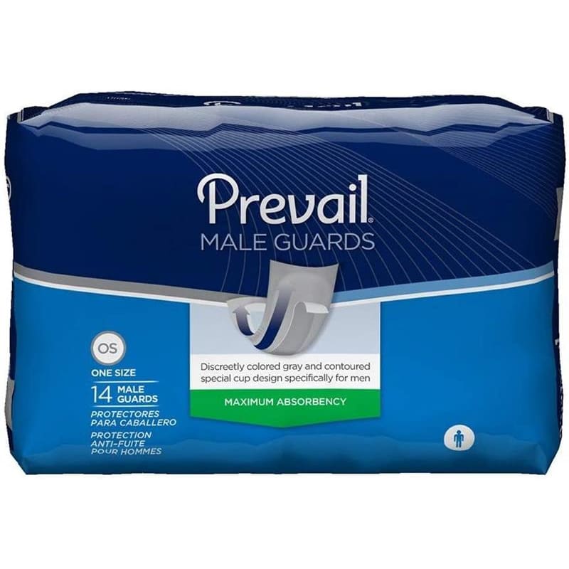 Prevail Maximum Absorbency Male Guards. Specifically designed to offer protection against light to moderate urinary incontinence, these guards are constructed with male anatomy in mind and with a cloth-like outer fabric offering unbeatable comfort. With a Target Acquisition Zone and a Blue Stay-Dry Strip, liquid is quickly wicked and locked away from the skin for ultimate skin dryness, leakage protection, and odor control. With a full-length adhesive strip. Pad Size: 12.4", 14/bag, 9 bags/case.