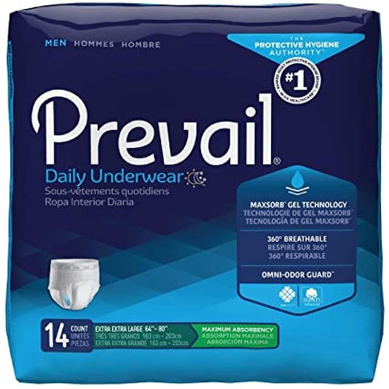 Prevail Maximum Absorbency Protective Underwear for Men. Designed to feel like everyday underwear, these underwear are ideal for men who have frequent leaks or sudden urges that don't allow time to find a bathroom. Features comfortable waist panels and fitted leg openings that provide a secure fit. The breathable, cloth-like fabric keeps wearers feeling fresh and dry every day. Size: XX-Large, 64"-80" Waist. 14/bag, 4 bags/case.