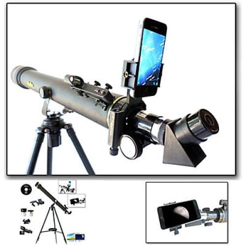 This Galileo800mm x 60mm Refractor Telescope and Galileo G-SPA Smartphone Adapter Kit lets you use the camera feature on your smartphone to take pictures or video through the optics of your telescope or use your smartphone to assist navigating your view to your celestial object of interest. Finding your target is easy with its Altitude Azimuth yoke mount featuring a slow motion altitude adjustment rod for precision adjustments and is attached to a very sturdy, fully adjustable and pre-assembled metal tripod with retractable rubber feet. Included are a 1 1/4″ 6mm eyepiece (133x power/magnification), a 1 1/4″ 20mm eyepiece (40x power/magnification) and a 90° erect image mirror.