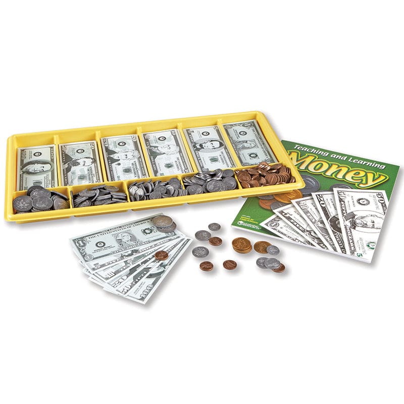 Jumbo money tray is filled with 100 plastic pennies, nickels, dimes and quarters; 50 half-dollars; 100 each of 1, 5, 10 and 20; and 50 each of 50 and 100 play money bills. Includes 64-page Money Activity Book. Tray measures 10.2" x 18.6". Ages 5 to 9