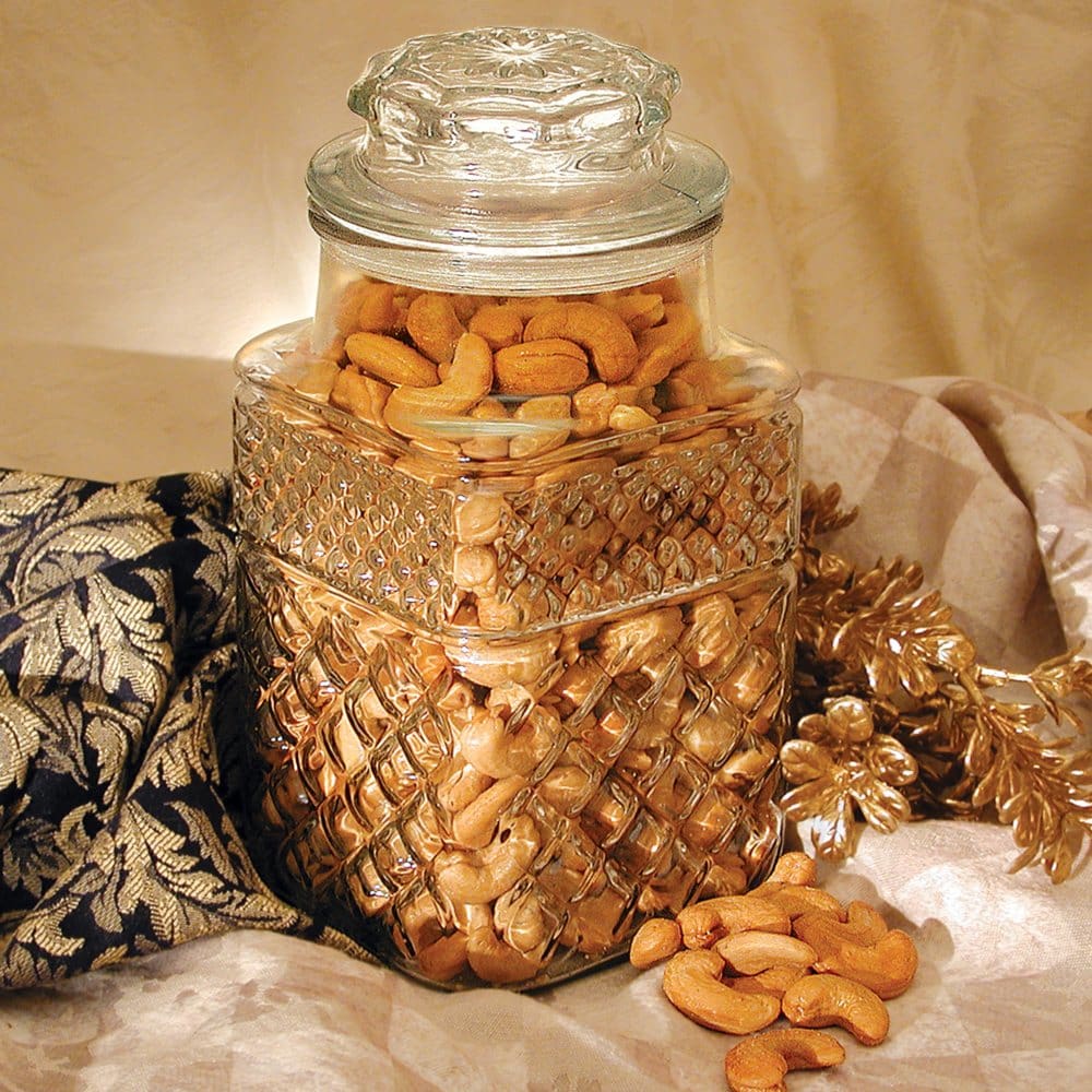 The cut Wexford glass jar with these Gold Kernel cashews creates an immediate impression the moment your gift is opened. Washable and reusable, this jar makes an ideal spot to stow loose change or mementos. The secure-fitting lid ensures the nuts inside stay fresh until ready to be enjoyed. Wrap a ribbon around this Golden Kernel Fancy jumbo cashew jar for a traditional finishing touch.