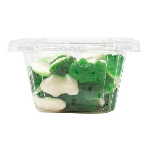 Ingredients: Gummi Frogs (corn syrup, sugar, gelatine; humectant: sorbitols; modified potato starch; acids: citric acid; gelling agent: pectins; natural and artificial flavor; glazing agent: beeswax, carnauba wax; vegetable oil [palm and palm kernel oils], color: Yellow 5, Blue 1.). Processed on equipment that also processes: Crustacean Shellfish, Egg, Fish, Milk, Peanut, Sesame, Soy, Tree Nuts (Almond, Brazil Nut, Cashew, Coconut, Filbert (Hazelnut), Macadamia Nut, Pecan, Pine Nut, Pistachio, Walnut) and Wheat.