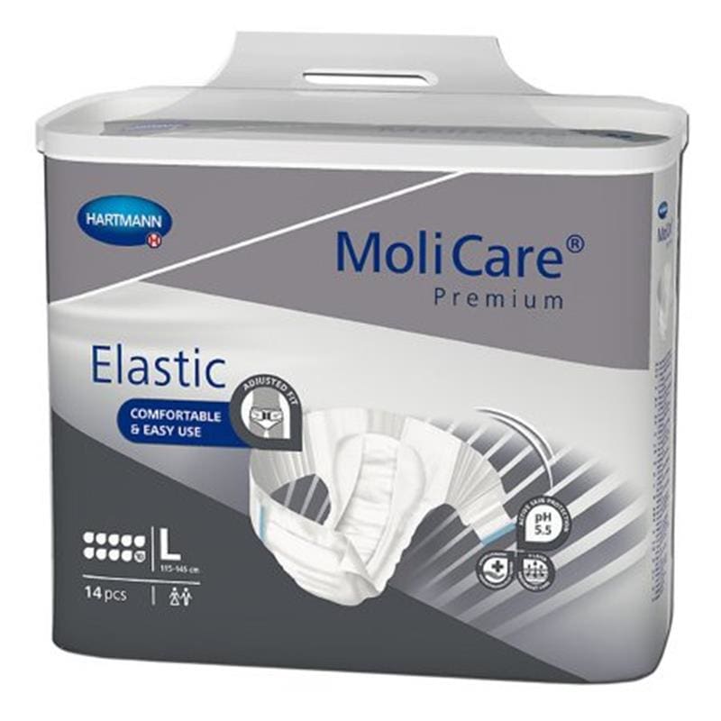Hartmann Molicare Premium Elastic 10D Adult Incontinence Briefs. These briefs are designed for all-in-one incontinence protection. Two elasticated side panels provide secure protection and help to maintain healthy skin. The brief adapts to all body shapes and movements with the combination of elasticated side panels and a single, extra-wide and recloseable hook tab on each side. Use for very severe incontinence. Size: Large, 45" - 57" waist-hip. 14/bag, 4 bags/case.