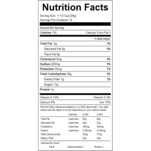 Ingredients: Corn flour, sugar, whole grain oat flour modified corn starch, honey, salt, turmeric (for color), niacinamide, reduced iron, zinc oxide (source of zinc), vitamin B6, riboflav- in (vitamin B2), vitamin A palmitate, thiamin mononitrate (vitamin B1), folic acid, vitamin B12, vitamin D. BHT is added to packaging material to preserve freshness. Made with Bioengineered Ingredient(s).