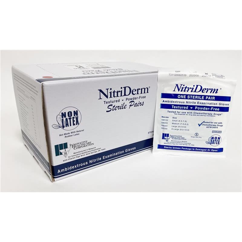 NitriDerm® Powder-Free Nitrile Series 108 Sterile Exam Gloves. Nitrile synthetic contains no natural rubber latex proteins and the soft, highly elastic formulation provides the maximum in comfort. The gloves are finger textured, providing excellent wet and dry grip as well as low modulus. Pair packaged, in ozone resistant multi-vac packaging. Tested for use with Chemotherapy Drugs, ASTM D6978. Powder-Free, Sterile. Size: Medium (7.5-8.0), Length: 9.5", Color: Blue. 50 pairs/box, 4 boxes/case.