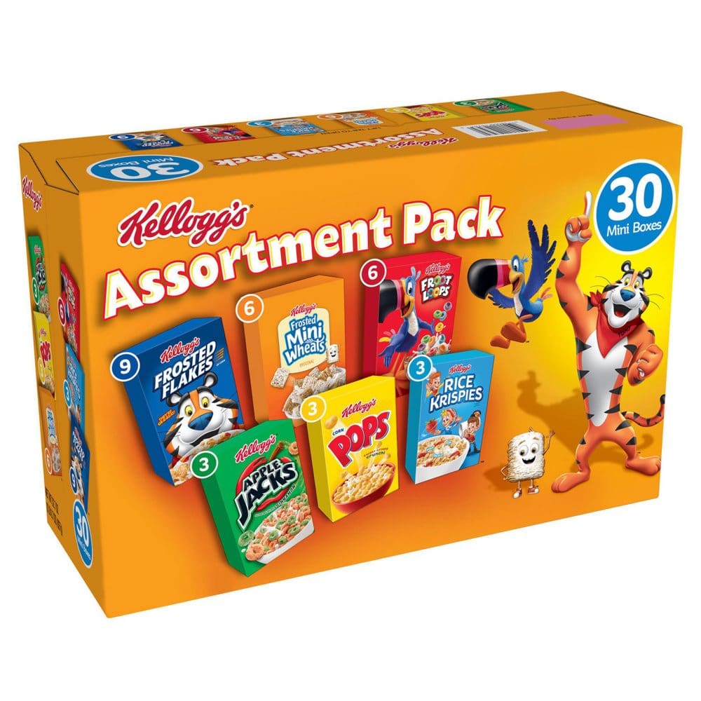 Kellogg's® Jumbo Assortment Pack (32.7 oz., 30 pk.) is a great way to provide multiple choices of breakfast cereal to your hungry household without purchasing multiple full-sized boxes. Kellogg's assortment pack contains 30 mini boxes of cereal, including Frosted Flakes, Frosted Mini Wheats, Froot Loops, Apple Jacks, Corn Pops and Rice Krispies.