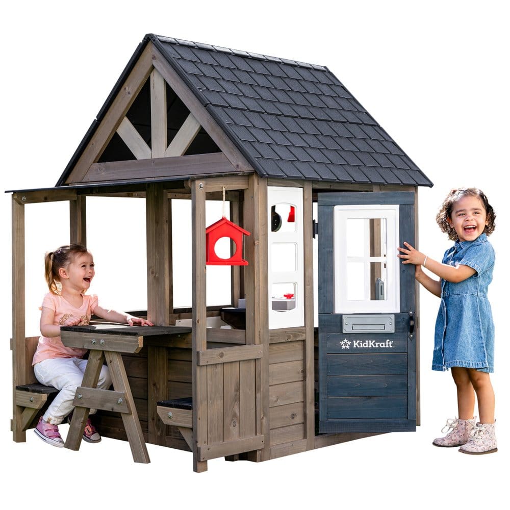 Check out KidKraft's Valley View Lodge Playhouse where kids can feel right at home while in the backyard. This outdoor wooden playhouse offers features to encourage imaginative role playing. Ring the working doorbell to enter the spacious interior highlighted by a kitchenette and hanging utensils. Exit out the flap door to circle around the front and enjoy a rest at the built-in table and bench. A hanging birdfeeder completes the homey aesthetics. Built of durable wood ideal to withstand outdoor conditions, the Valley View Lodge Playhouse will remain a favorite spot for years to come.
