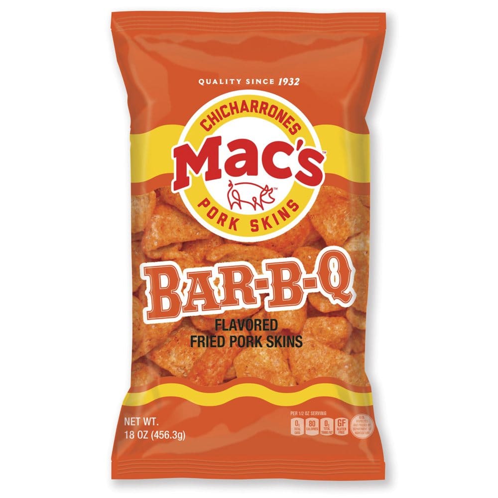 For a light snack that is full of flavor and crunchiness, try Mac's BBQ Pork Skins. Pork rinds are a low-carb, Keto- and Paleo-friendly alternative to other salty snacks. They have fewer carbohydrates and a high content of protein. A one-ounce serving contains nine times the protein and less fat than a serving of potato chips. Fifty-nine percent of a pork skin fat is unsaturated with most of that as oleic acid, the same healthy fat found in olive oil. The high protein in pork rinds satisfies your snack craving because pork rinds have a high satiation effect. Perfect for parties, sporting events, work, or simply in the comfort of your own home. Each serving contains 80 calories, and they contain less than one gram carbohydrates per serving and zero trans fat. Founded in 1932, Mac's is known for crafting quality snacks.