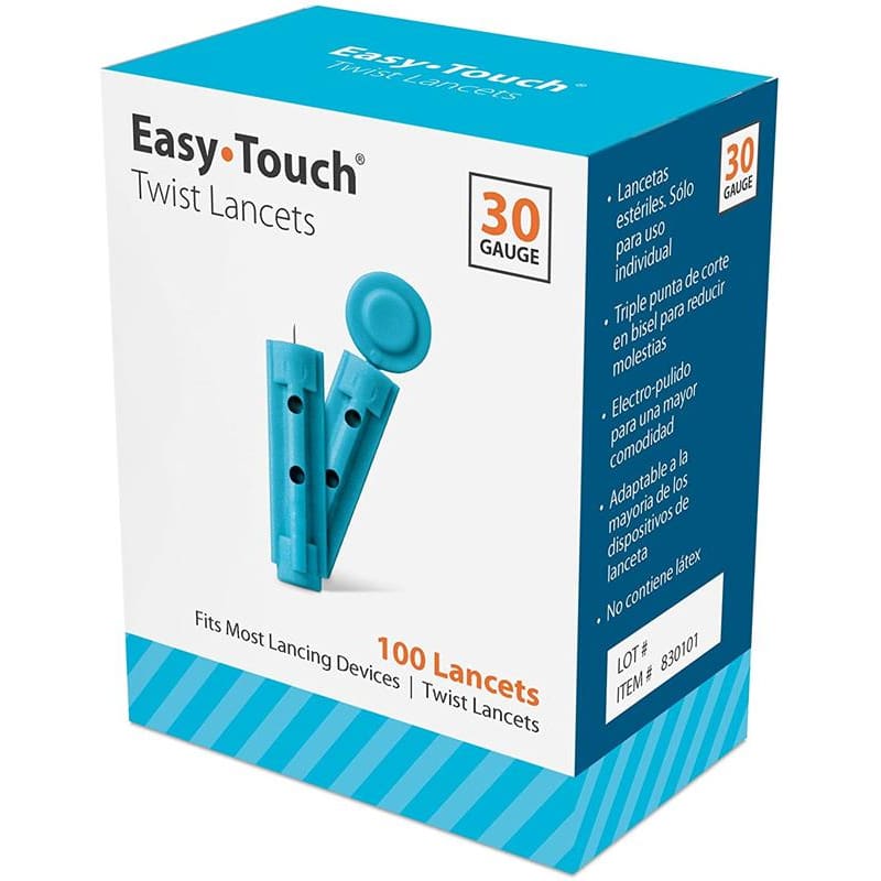 EasyTouch® Twist Lancets. These lancets are designed to fit the most commonly used lancing devices and have extra-sharp, triple beveled needles for users to experience as little pain as possible. Latex-free. Size: 30 G, Color: Blue. 100/box, 10 boxes/case.