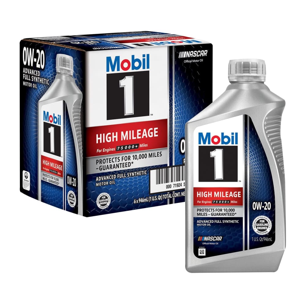 Give your higher mileage engine the care it deserves with Mobil 1 High Mileage full-synthetic motor oil 0W-20. This formula utilizes Mobil 1โs signature Triple Action Formula to deliver outstanding engine performance, protection, and cleanliness to vehicles with over 75,000 miles. Mobil 1 High Mileage motor oil extends engine life by reducing friction and preventing deposits and sludge buildup - keeping critical engine parts clean and protected for up to 10,000 miles between oil changes.* This technologically advanced motor oil formulation provides 10X** better internal engine heat protection than industry standards (up to 500 degrees Fahrenheit), as well as exceptional low-temperature protection (to -30 degrees Fahrenheit)โbringing quick cold-weather starting and ultra-fast protection to your engine. Mobil 1 High Mileage motor oil meets ILSAC GF-6 standards to help provide low-speed pre-ignition (LSPI) and timing chain wear protection while keeping your engine clean and helping to improve your fuel economy. Available in a 6 pack of 1-qt. bottles, Mobil 1 High Mileage full-synthetic motor oil 0W-20 also helps control oxidation to prevent oil breakdown and is recommended by ExxonMobil for all types of modern cars, SUVs, light vans, and light trucks - including those with high-performance, turbocharged, supercharged, multi-valve, or fuel-injected engines.