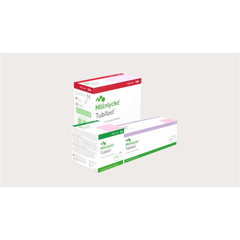Molnlycke Tubifast Elasticated Viscose Tubular Bandages. These bandages are made with rayon knitted into the fabric to provide light elasticity and hold dressings securely without constriction or compression. With 2-way stretch, patients have complete freedom of movement while the open weave fabric allows air to circulate over the skin to help avoid maceration. Does not contain natural rubber latex. Size: 2" x 10 Meters, for small to medium limbs, Limb Size: 5.5? - 9.5?, Line Color: Green.